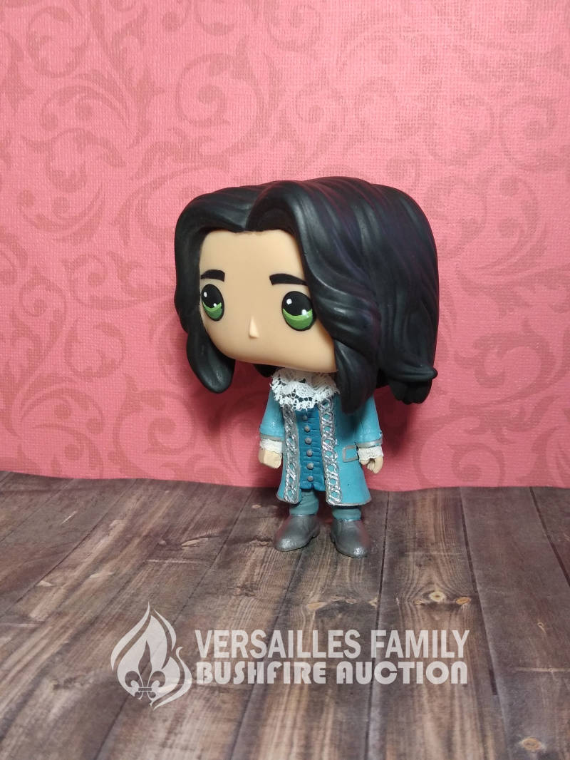 Mini Monsieur - is a mixed media custom Pop sculpture made of vinyl, clay, acrylic paint and fabric. He's adorned with court hair and the light blue coat, trimmed with silver from season 3. The outfit is completed with lace cuffs and cravat. Monsieur is 10cm in height.